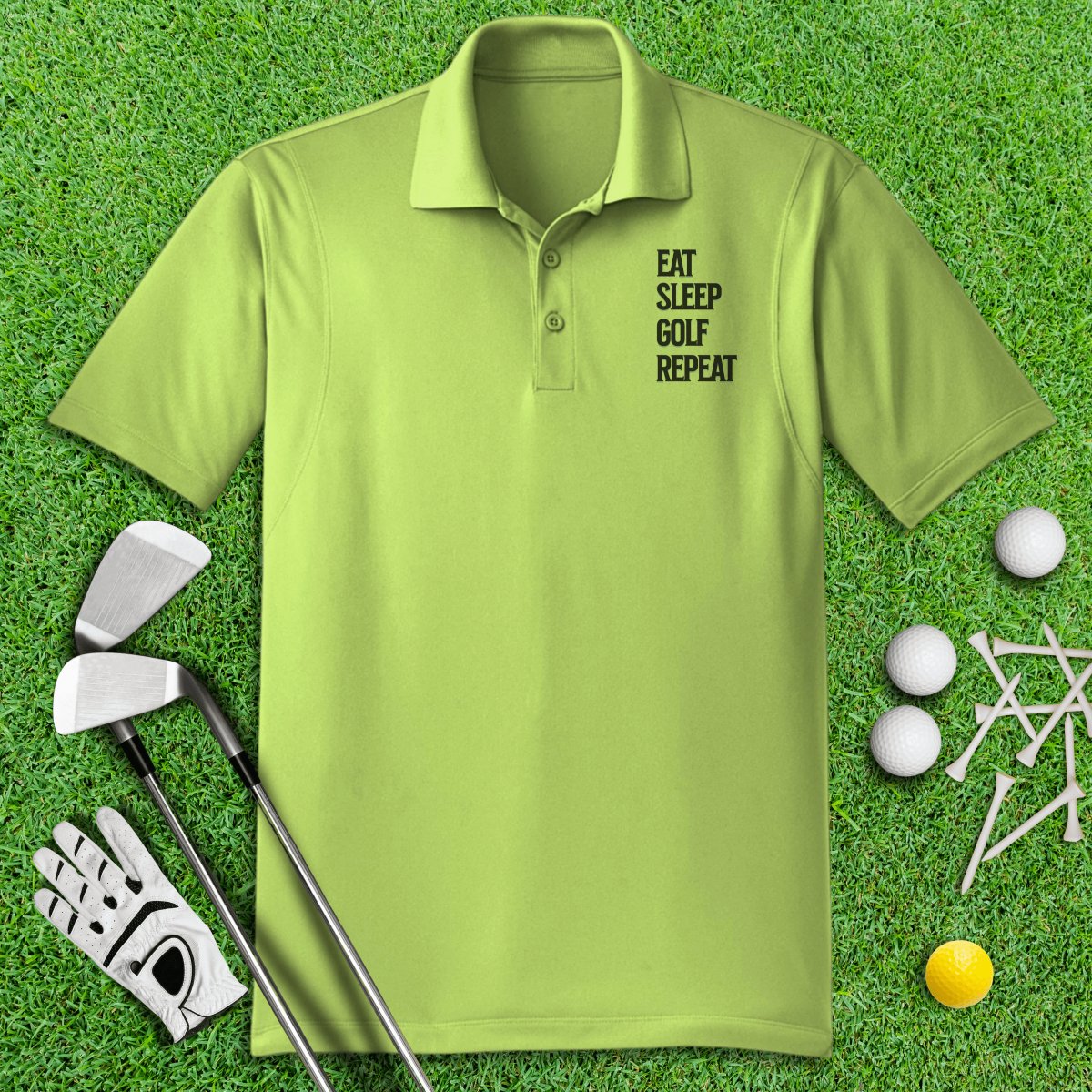 For the golf addict in you: our "Eat Sleep Golf Repeat" Polo Shirt! Perfect for those who live, breathe, and dream about the next tee time. Stay cool, look sharp, and let everyone know your life priorities!