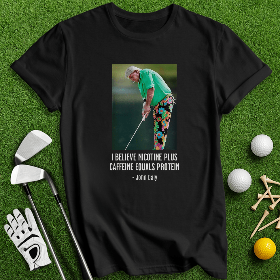 The John Daly “Nicotine + Caffeine = Protein” design is a tribute to golf’s most legendary outlaw and his famous quote. Who needs protein shakes when Daly already solved the equation? Available as a T-shirt, crewneck, or hoodie, this piece is built for comfort whether you’re teeing off, lounging at the 19th hole, or just showing off your love for Daly’s one-of-a-kind lifestyle.
